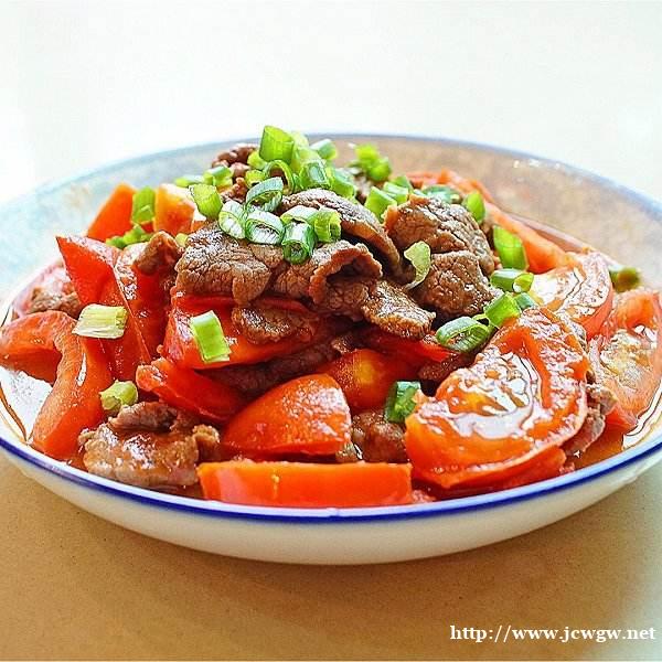 ③炒勺内加植物油,烧至五成热时加葱、姜末炒出香味,倒入牛肉翻炒,烹入黄酒、清汤稍煨,加番茄块、精盐炒熟即成。